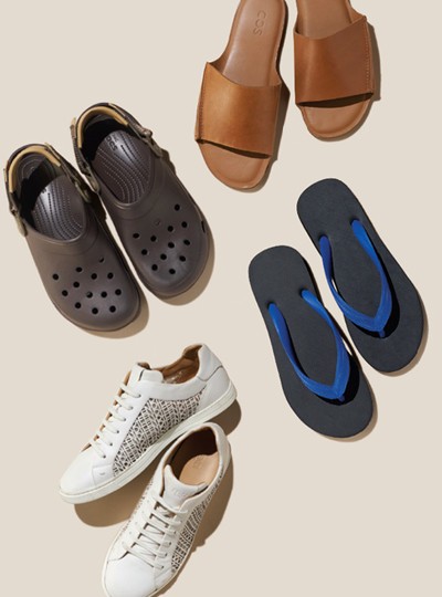 1 가볍고 편안한 크로슬라이트™ 소재의 슈즈 6만9천9백원 크록스 제품. 2 가죽 소재 슬라이드 13만5천원 코스 제품. 3 밑창과 끈의 색상을 직접 조합할 수 있는 플립플롭 3만5천원 시아보 by 서프코드 제품. 4 레이저 커팅된 가죽 소재 스니커즈 가격미정 펜디 제품.