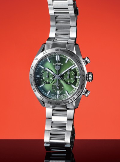태그호이어가 창립 1백60주년을 맞아 브랜드의 대표적인 까레라 컬렉션을 새롭게 재정비했다. ‘손목 위의 레이스카 대시보드’라는 수식어가 붙는 까레라 컬렉션은 스포츠 크로노그래프 중에서도 숨이 멎을 정도로 긴박한 레이싱 경기에서 탁월한 능력을 발휘했다. 진중하고 우아한 인상의 올리브색 다이얼과 그에 걸맞은 자체 제작 무브먼트인 호이어 02 무브먼트를 탑재해 80시간 파워 리저브를 제공한다. 또한 짧아진 러그 디자인 덕분에 지름 44mm 케이스를 손목 위에 얹어도 부담 없이 편안하다.
