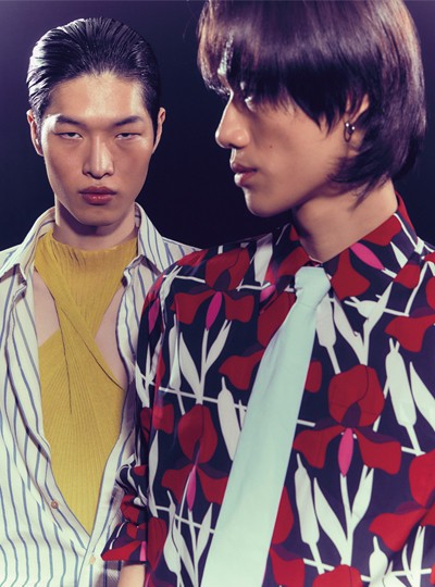 (왼쪽부터) 줄무늬 셔츠 구찌, 니트 톱 보테가 베네타 제품. 꽃무늬 셔츠·흰색 타이 모두 프라다 제품.