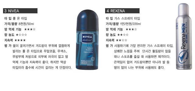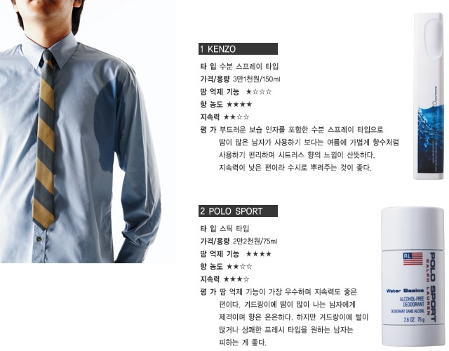 드레스 셔츠의 단추를 세 개쯤 풀고 소매를 살짝 걷어 올린 채 열심히 일에 몰두하는 남자의 모습은 여자들이 생각하는 섹시한 남자의 이상적인 모습일 것이다. 하지만 너무 열심히 일한 나머지 겨드랑이에 땀이 차버렸다면 그 상황은 생각만 해도 끔찍하다. 올여름 데오도란트는 남자의 섹시함을 지켜줄 필수 아이템이다. 하지만 나에게 맞는 데오도란트는 따로 있다. 크게 네 가지 타입으로 나눌 수 있으며 향수처럼 사용할 수 있는 수분 스프레이 타입과 활동량이 많은 남자에게 제격인 가스 스프레이 타입, 순하고 자극이 적은 롤 온 타입, 땀 억제 기능이 탁월한 스틱 타입까지. 올여름 자신에게 맞는 데오도란트로 여심을 사로잡아보자.