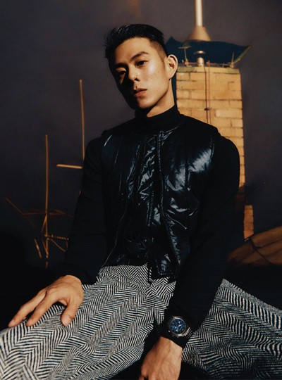 블랙 컬러 케이스와 로즈 골드 컬러 인덱스가 돋보이는 지름 43mm의 남성적인 워치 73만원 엠포리오 아르마니 워치 제품. 이너 스트랩 장식의 블루종·벨트·데님 팬츠 모두 엠포리오 아르마니, 흰색 티셔츠 스타일리스트 소장품.