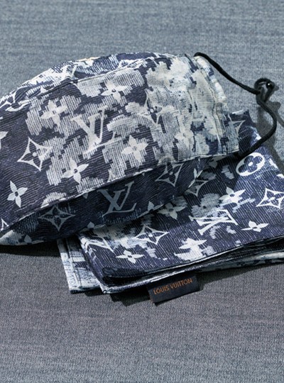 얇고 가벼운 100% 코튼 소재로 이뤄진 모노그램 패턴의 마스크. 같은 소재의 반다나, 파우치와 세트 구성 가격미정 루이 비통 제품.