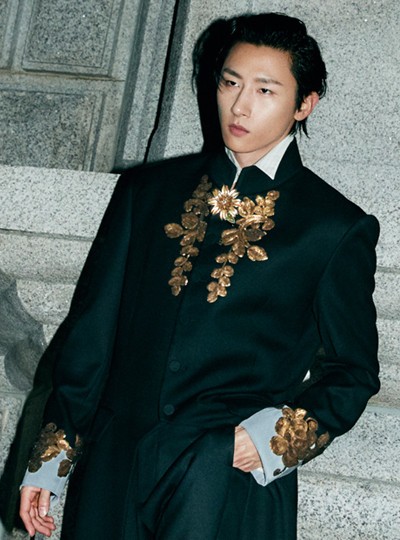 골드 디테일 롱 코트·팬츠 모두 김서룡 옴므, 이너 셔츠 던힐, 부츠 로스트가든, 골드 플라워 브로치 벨앤누보 제품.