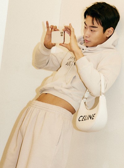 크롭트 길이의 후디·배기 스웨트 팬츠·더비 슈즈 모두 가격미정 발렌시아가, 레터링 로고 프린트 핸드백 가격미정 셀린느 옴므 by 에디 슬리먼 제품.