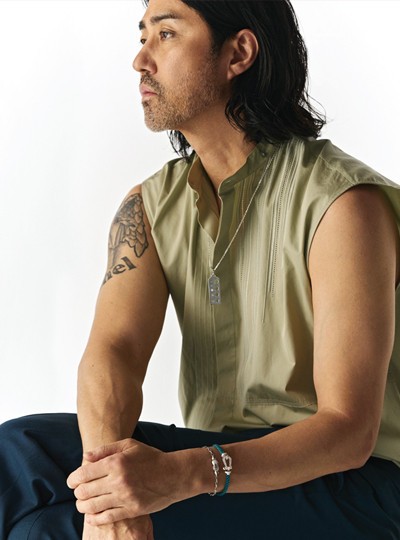 브릴리언트 컷 다이아몬드가 세팅된 화이트 골드 스톤 칼리버 펜던트·화이트 골드 스톤 칼리버 체인·64개의 브릴리언트 컷 화이트 다이아몬드가 세팅된 18K 화이트 골드 버클과 튀르쿠아즈 컬러 텍스타일 소재의 스테인리스 스틸 엔드 캡 포스텐 브레이슬릿·18K 화이트 골드에 18개의 브릴리언트 컷 화이트 다이아몬드가 세팅된 버클과 조합한 18K 화이트 골드 디테일 케이블의 샹스 인피니 브레이슬릿 모두 프레드, 팬츠 제냐, 슬리브리스 셔츠 스타일리스트 소장품.