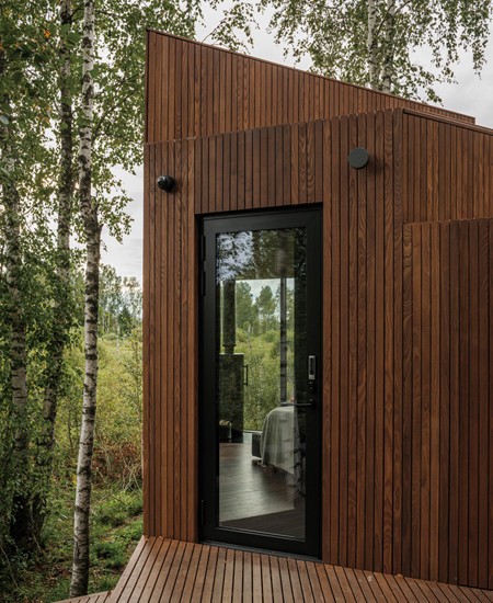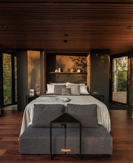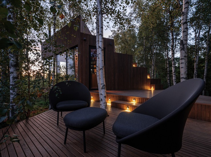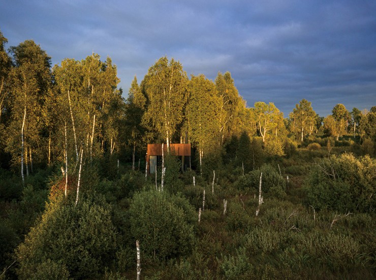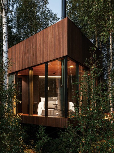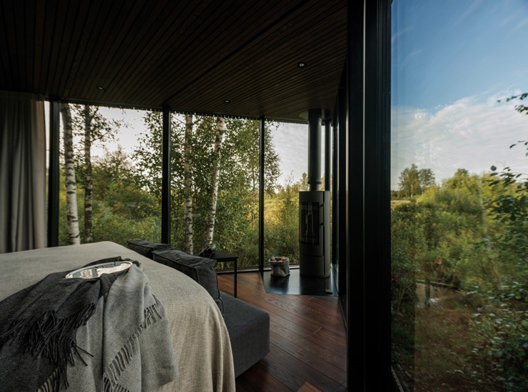 매들라 네이처 빌라는 에스토니아 자작나무 숲에 위치한 작은 호텔이다. 28㎡ 규모의 아늑한 객실은 늪 건너 숲에 숨어 있다. 멀리서 보면 그저 자작나무만 무성하다. 자연과 완전한 일치를 이룬다. 객실에 가기 위해서는 카누를 타고 늪을 건너 테라스를 통해 입장해야 한다. 객실은 건조한 상태를 유지하게 설계되었다. 설계 과정의 목표는 숲의 나무를 자르지 않는 것이었다. 그래서 나무들 사이 작은 공터에 건물을 세웠다. 테라스에 앉으면 바람에 흔들리는 자작나무를 감상할 수 있다. 숲의 일부가 된 기분은 두 면이 통창으로 개방된 침실에서도 이어진다. 건물을 받치는 두 개의 강철 빔과 기둥을 제외한 대부분의 소재는 열 처리된 목재를 사용해 내구성이 강하다. 객실과 이어진 계단을 따라 지붕에 오르면 자작나무 사이로 노을을 감상하고, 별과 새를 관찰하는 여유를 만끽할 수 있다.