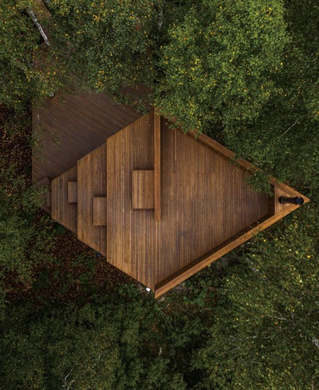 방문객이 짧은 기간 편안함을 누리기에 필요한 것들을 작은 공간에 알차게 넣었다. 아주 작은 공간에 필요한 것은 무엇일까. 이 조건에 맞추기 위해 집 모양은 불규칙하고, 여러 개의 삼각형으로 설계했다. 삼각형 침실은 자연과 마주하기에 안성맞춤이다. 침대에 기대 누워 눈 앞에 펼쳐진 아름다운 경관을 감상한다. 침실과 작은 소파, 작업 공간, 휴식 공간 등 여러 기능을 갖는다. 작은 욕실에는 바닥에서 천장까지 거울이 이어져 있다. 테라스에는 건물을 유지 관리하는 기능들이 숨어 있다.