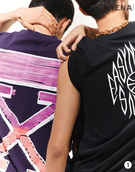 1 백 프린팅 티셔츠 43만원 오프화이트 제품. 타이포그래피 일러스트 티셔츠 4만5천원 나이키, 체인 네크리스 1만7천9백원 H&M 제품.