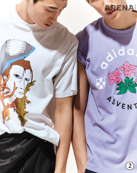 2 익살스러운 표정의 일러스트가 그려진 티셔츠 72만원·오버올 팬츠 2백5만원 모두 버버리 제품. 어드벤처 플라워 일러스트 티셔츠 4만9천원 아디다스 제품.