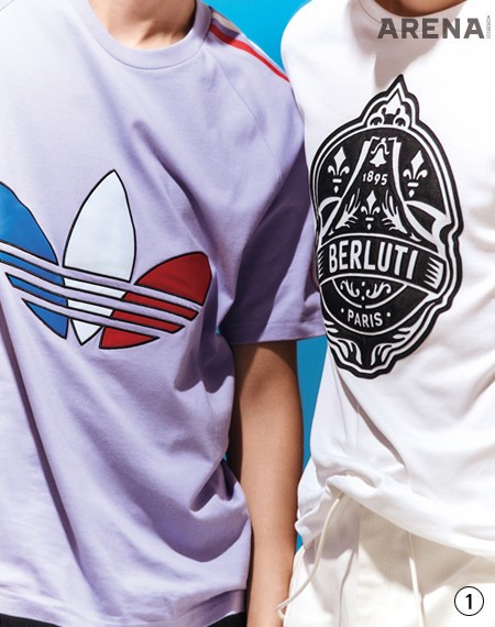 1 배색 로고 티셔츠 5만9천원 아디다스 제품. 로고 엠블럼 티셔츠 가격미정 벨루티, 와이드 팬츠 74만원 2 몽클레르 1952 제품.