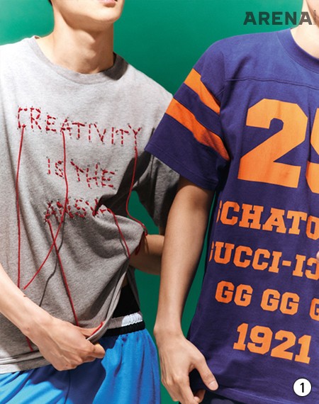 1 털실로 레터링 자수를 놓은 티셔츠 32만8천원 골든구스, 반바지 가격미정 나이키 제품. 레터링 유니폼 티셔츠 80만원 구찌 제품.