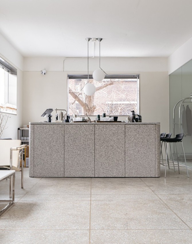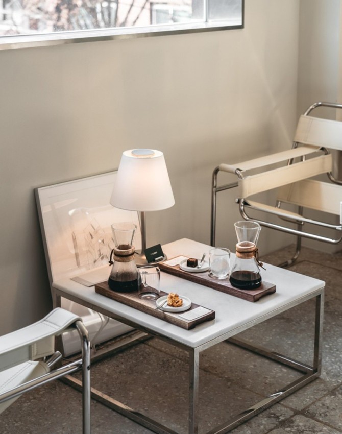 두 번째 공간 ‘3층 로비’는 용산 골목에 꽁꽁 숨겨져 있으니 두 눈 힘주고 찾아 다녀야 한다. 카페가 절대 존재하지 않을 것만 같은 낡은 건물 3층에 둥지를 틀었다. 3층 로비는 핸드드립 커피 전문으로, 에티오피아 예가체프, 케냐 키암부 AA, 콜롬비아 수프리모로 이루어져 있다. 원두에 대한 정보는 테이스팅 노트에 적혀 있으니 취향대로 고를 것. 커피는 케멕스에 담긴 채로 내어지며 커피에 맞는 디저트가 함께 달려온다. 커피 외에 주목할 점은 공간이다. 내부로 들어서면 화강암으로 만든 네모 반듯한 바 테이블이 눈에 띤다. 이 공간을 단단히 잡아주는 중심부 역할을 하는 곳으로, 커피가 내려지는 과정이 한눈에 펼쳐진다. 세 명의 건축가가 만든 공간이기에 좁은 복도를 사이에 두고 마주한 방엔 세 명의 건축가의 작업 공간이 자리하고 있다. 커피 외에 밀크티와 다양한 티 종류, 티라미수 케잌도 있다. 평일 주말 상관 없이 오후 12시에 오픈이며 월요일은 휴무다.