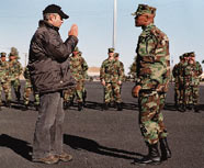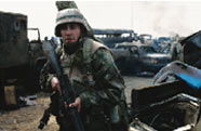 ← 낯선 이라크의 도시 “저는 여기서 이 영화 중 유일하게 현재의 이라크를 담고 있는 장면을 연출했습니다. 사방이 트인 사막에서 몇 주간을 보내고 영화 마지막 부분에 갑자기 이 도시적 풍경을 대하니 기분이 묘하더군요. 그리고 최신 무기와 군복을 다루면서 숙연해졌습니다. 현재 진행되고 있는 전쟁은 우리가 다룬 전쟁보다 더 무섭습니다. 제 생각에 이 전쟁에서 가장 두려운 점은 적이 적처럼 보이지 않는다는 겁니다. 적은 너무 평범하게 길모퉁이에 서서 휴대폰으로 통화하고 있는 시민이니까요.” |