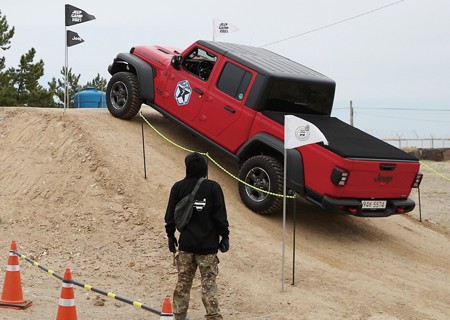 이번 행사에 준비된 오프로더들은 랭글러 2도어와 4도어, 루비콘, 사하라, 오버랜드에 글래디에이터, 체로키, 레니게이드도 있었다. 14대가 넘는 개성 강한 오프로더 중 시승한 차량은 글래디에이터다. 글래디에이터는 전장이 5,600mm에 달해 지프 차량들 중 가장 길다. 가장 긴 차를 타고 굽이진 오프로드 코스를 통과할 생각을 하자 부담된 건 사실이었다. 쇼트 보디를 탔다면 조금 더 수월했을까. 첫날 일정은 ‘지프 웨이브 파크’에서 치러졌다.