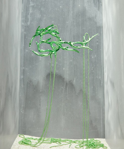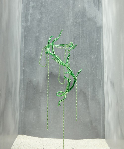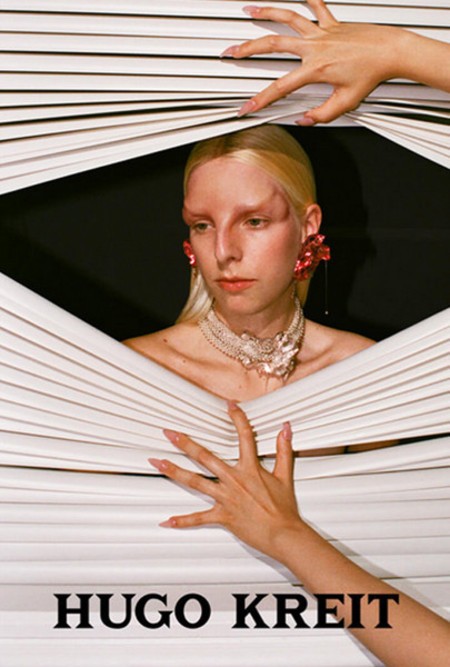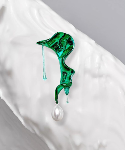 휴고 크레잇의 주얼리는 곧 쏟아져 내릴 것 같은 불안정하고 아찔한 형태를 지닌다. 게다가 수지와 알루미늄, 황동, 액체 크롬 등 장신구보다는 우주선이나 차를 만드는 데 어울리는 합성 재료에 진주, 크리스털, 유색 보석 등의 천연 재료를 더해 기존의 주얼리 브랜드에서는 본 적 없는 생동하는 질감의 주얼리를 다룬다. 산업 디자인 쪽 일을 했었고, 에르메스와 디올, 자크뮈스의 패션쇼의 제작 경험이 있는 그의 배경을 알고 나면 그의 컬렉션을 이해하는 데 조금이나마 도움이 될 거다. 스스로 파괴적이고 이상한 지점에서 매력을 찾는다는 휴고 크레잇(Hugo Kreit)은 그의 실력을 유감없이 발휘한 그의 미학적인 주얼리를 ‘수공예 외계 주얼리’라고 소개한다. 이보다 더 극적이고 적당한 표현을 떠올려봤지만 찾기 어렵다.