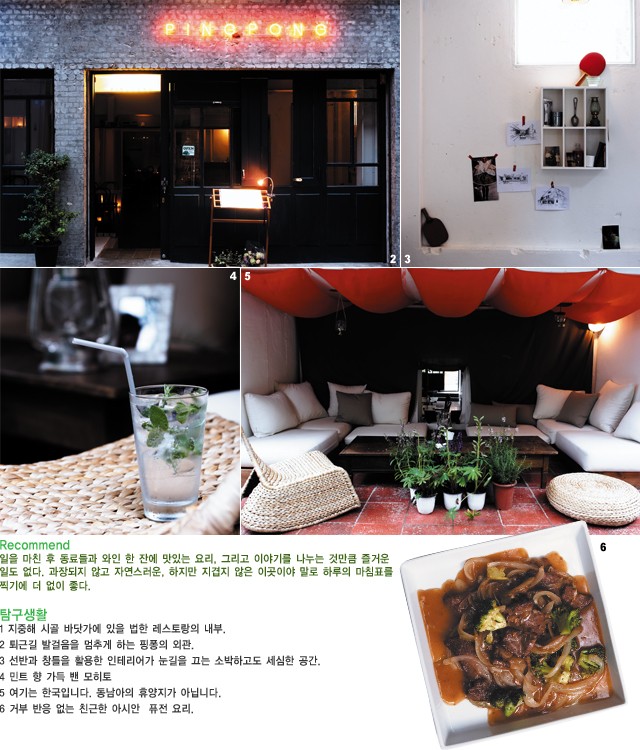 핑퐁에는 아시안 퓨전 요리와 와인, 그리고 휴식이 있다. 흰색 회벽과 베이지색 타일, 앤티크한 가구, 그리고 막자란 풀들이 어우러진 그리스 시골 바닷가에 있을 법한 조용한 레스토랑이다. 뒷마당의 이국적인 소파 또한 여느 레스토랑과 다르다. 가정집을 개조해서 만든 이곳에는 과거와 현재, 휴양지와 시골 할머니집의 느낌이 교묘히 혼합되어 있다. 배우 류승범이 이곳의 주인이라면 핑퐁의 분위기가 지레 짐작 가지 않을까. 우선, 평범하진 않지만 편안하다.