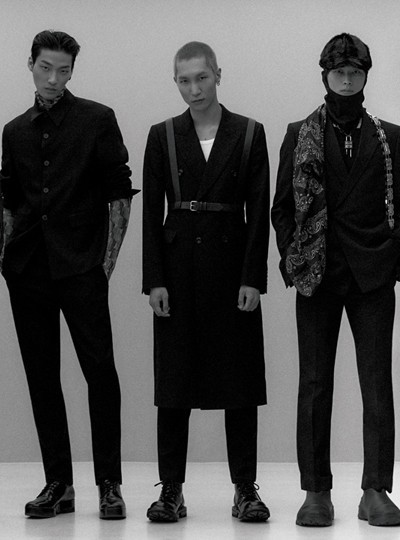 (왼쪽부터) 검은색 재킷·팬츠·기하학 패턴의 보디 수트·더비 슈즈 모두 가격미정 프라다 제품. 블레이저 코트·팬츠·흰색 슬리브리스 톱·하네스·레이스업 부츠 모두 가격미정 알렉산더 맥퀸 제품. 패드록 여밈 재킷·니트 팬츠·스퀘어 넥 탱크 톱·검은색 체인 목걸이·발라클라바·퍼 캡·사각 체인 스트랩 토트백·검은색 마시멜로우 하이브리드 슈즈 모두 가격미정 지방시 제품. 재킷·팬츠·피티드 톱·디스트로이드 피어싱 장식 캡·슈발리에 더비 슈즈 모두 가격미정 발렌시아가 제품. 줄무늬 블레이저·팬츠·셔츠·캐니언 앵클부츠 모두 가격미정 루이 비통 제품.