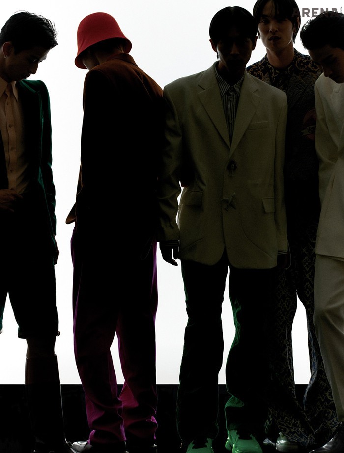 초록색 벨벳 재킷 4백40만원·초록색 벨벳 팬츠 1백94만원·연핑크색 실크 셔츠 1백10만원·레더 솔 부츠 가격미정 모두 구찌 제품. 오렌지색 버킷 해트·밤색 블레이저·핑크색 팬츠·그러데이션 무늬 셔츠·갈색 더비 슈즈 모두 가격미정 벨루티 제품. 비행기 버튼 장식 흰색 재킷·초록색 팬츠·줄무늬 셔츠·초록색 밀레니엄 스니커즈 모두 가격미정 루이 비통 제품. 자카르 소재 블레이저·실크 팬츠·실크 셔츠 모두 가격미정 루이 비통 제품. 흰색 재킷·팬츠 모두 가격미정 돌체앤가바나 제품.
