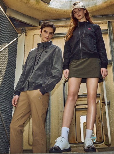 그레이 레이어 재킷·베이지 팬츠 모두 어뉴골프 제품. 블랙 레이어 재킷·카키 스커트·화이트 로고 삭스·블랙 & 화이트 배색 스터드 태슬 슈즈·로고 패턴 버킷 해트 모두 어뉴골프 제품.