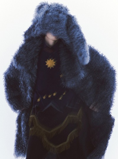 페이크 퍼 더플 코트·프린지 장식 셔츠·이너로 입은 티셔츠·울 팬츠·레더 삭 부츠 모두 가격미정 버버리 제품.