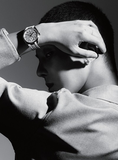 18캐럿 옐로 골드 케이스, 돔 형태의 크리스털 실버 다이얼, 그레이 레더 스트랩의 트레저 코‑액시얼 마스터 크로노미터 스몰 세컨즈 40mm 2천2백60만원 오메가 제품.