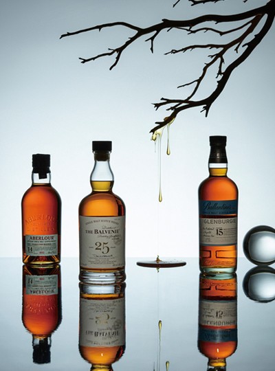 (왼쪽부터) 달달한 바닐라와 꿀에 잘 익은 체리와 밀크 초콜릿 향이 살짝 감도는 ‘아벨라워 14년 더블캐스크’, 발베니 특유의 과감한 달콤함에 구운 마시멜로와 진한 오크 향이 버무려진 ‘발베니 25년 레어 매리지’, 배와 붉은 사과 향에 벌꿀 향이 로맨틱하게 어우러져 긴 여운을 선사하는 ‘발렌타인 싱글 몰트 글렌버기 15년.’