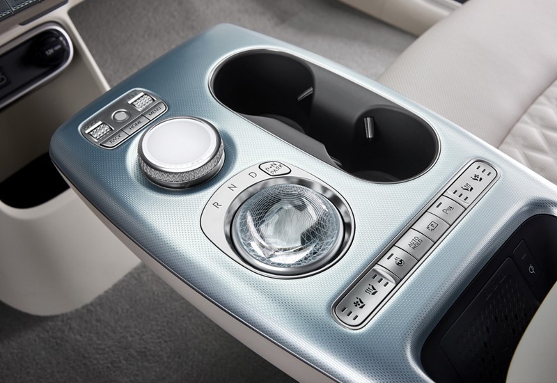 일단 GV60을 타면 키가 필요 없다. 디지털 키도 마찬가지다. B 필러에는 애플 페이스 ID와 같은 기술인 근적외선 얼굴 인식 시스템이 달려 있어 운전자의 얼굴을 인식하고 문을 연다. 딥러닝 기술을 활용해 안경이나 모자, 심지어 두꺼운 화장을 해도 운전자 얼굴을 정확하게 인지한다고 한다. 실내에 들어가 시동을 걸 때는 지문 인식 시스템을 활용해 시동 걸 수 있다. 뿐만 아니라 운전자가 설정한 운전석 시트 위치와 사이드미러 각도도 알아서 조정된다. 변속기는 지금껏 본 적이 없는 형상이다. 구로 된 전자식 변속기, 크리스털 스피어가 들어간다. 시동이 꺼져 있을 땐 무드등이 들어오고 시동을 걸면 크리스털 스피어가 회전하면서 변속기가 나타난다. 크리스털 스피어는 변속뿐 아니라 운전 가능 상태를 직관적으로 알려준다. 전기차는 내연기관차와 달리 소리가 없으니 시각적으로 정보를 전달하는 것이다. 크리스털 스피어가 추가됐을 뿐인데 GV60을 급진적인 미래차로 만들 만큼 효과가 크다. ★★★☆