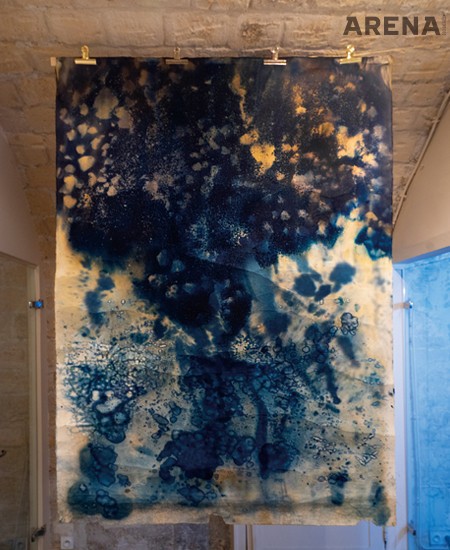 전시장이 총 두 층인데, 한 층에 있는 작품들은 모두 제주에서 만들었다. 파리의 록다운이 길기도 했고, 팬데믹으로 힘들었던 터라 제주에서 쉴 겸 작품을 만들러 떠났었다. 거기서 제주만의 특색 있는 광물인 현무암을 작업에 활용하게 됐다. 한지 위에 인화 용액을 바르고, 현무암을 한지 위에 얹어 바다에 담그는 등의 작업을 했다. 자연 그대로의 돌 형태가 작품에 담겼고, 인공광이 아닌 자연광을 통해 인화된 작품들이다. 제주는 9월 한 달만 있어도 사계절을 모두 체험하는 기분이 들 만큼 기후 변화가 남다르다. 그런 제주의 매력이 작품에 그대로 담겼다.