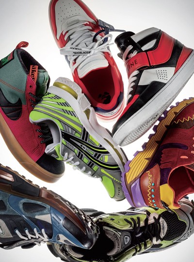 왼쪽부터 시계방향으로) 나이키 SB 줌 블레이저 미드 PRM 가격미정 나이키, 형광색 젤 키리오스 스니커즈 15만9천원 아식스 스포츠스타일, 카프 레더 소재의 아웃 오브 오피스 스니커즈 71만원 오프화이트, CT-03 하이톱 스니커즈 가격미정 셀린느 옴므 by 에디 슬리먼, 태슬과 스티치, 원석의 이국적인 세부가 돋보이는 얼스 비트 스니커즈 가격미정 에트로, 러너 스니커즈 1백42만5천원 발렌시아가, GIV 1 러너 스니커즈 1백36만원 지방시 제품.