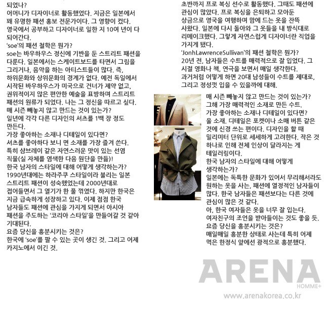 이전 기사보기 다음 기사보기 같은 듯 다른 글자크기 설정 가 가 기사의 본문 내용은 이 글자크기로 변경됩니다. 스크롤 이동 상태바 미분류기사 같은 듯 다른 입력 2011.01.03 19:11 댓글 0 글자크기 설정 가 가 기사의 본문 내용은 이 글자크기로 변경됩니다. 한 남자는 아버지의 영향을, 또 다른 남자는 어머니의 절대적인 영향을 받으며 자랐다. 한 명은 영국 테일러링에, 또 다른 남자는 일본 스트리트 패션에 미쳐있다. 생김새부터 말투까지 평행선처럼 공통점이 없는 이 둘은 절친한 친구이자 지금 일본을 대표하는 디자이너다. CREDIT INFOEDITOR 김민정 PHOTOGRAPHY 김린용 COOPERATION 퍼블리시드 이 기사를 공유합니다 키워드 #패션 #스트리트 #남자 #일본 #디자이너 저작권자 © 아레나옴므플러스 무단전재 및 재배포, AI학습 및 활용 금지