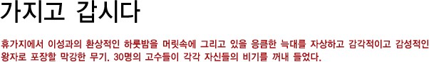휴가지에서 이성과의 환상적인 하룻밤을 머릿속에 그리고 있을응큼한 늑대를 자상하고 감각적이고 감성적인 왕자로 포장할 막강한 무기.30명의 고수들이 각각 자신들의 비기를 꺼내 들었다.<br><br>[2007년 7월호]