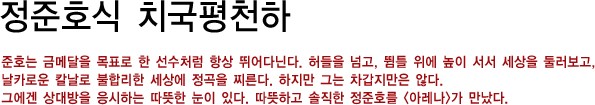 정준호는 금메달을 목표로 한 선수처럼 항상 뛰어다닌다. 허들을 넘고, 뜀틀 위에 높이 서서 세상을 둘러보고, 날카로운 칼날로 불합리한 세상에 정곡을 찌른다. 하지만 그는 차갑지만은 않다. 그에겐 상대방을 응시하는 따뜻한 눈이 있다. 따뜻하고 솔직한 정준호를 <아레나>가 만났다. <br><br>[2007년 7월호]