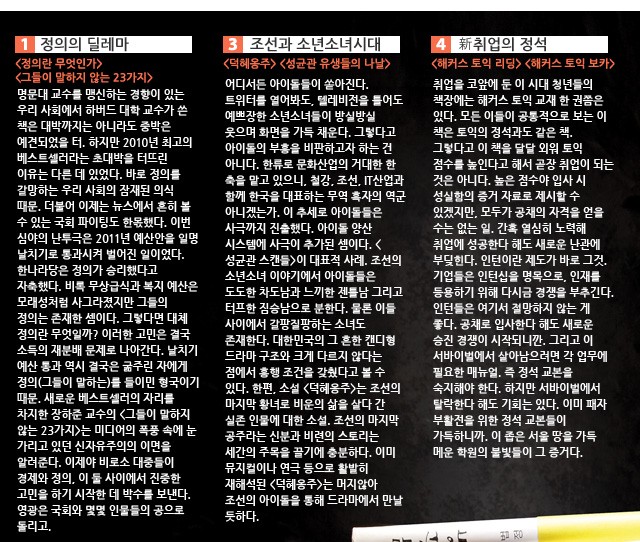 이전 기사보기 다음 기사보기 베스트셀러 돌아보기 글자크기 설정 가 가 기사의 본문 내용은 이 글자크기로 변경됩니다. 스크롤 이동 상태바 미분류기사 베스트셀러 돌아보기 입력 2011.01.31 14:46 댓글 0 글자크기 설정 가 가 기사의 본문 내용은 이 글자크기로 변경됩니다. 지난해 베스트셀러들을 훑으니 지난 1년이, 그리고 어제 본 뉴스들이 불현듯 눈앞을 지나갔다. 잘 팔리는 책들에는 그만한 사연이 있었다. CREDIT INFOGUEST EDITOR 조진혁 PHOTOGRAPHY 박종수 이 기사를 공유합니다 저작권자 © 아레나옴므플러스 무단전재 및 재배포, AI학습 및 활용 금지