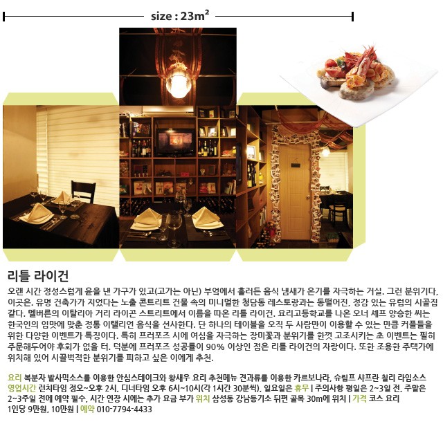 이전 기사보기 다음 기사보기 여심 잡는 2인용 레스토랑 글자크기 설정 가 가 기사의 본문 내용은 이 글자크기로 변경됩니다. 스크롤 이동 상태바 LIFE 여심 잡는 2인용 레스토랑 입력 2011.02.02 22:31 댓글 0 글자크기 설정 가 가 기사의 본문 내용은 이 글자크기로 변경됩니다. 작아서 아늑하고, 아늑해서 괜스레 로맨틱해지는 곳이 있다. CREDIT INFOGUEST EDITOR 조진혁 PHOTOGRAPHY 박종수,최재학 이 기사를 공유합니다 키워드 #레스토랑 저작권자 © 아레나옴므플러스 무단전재 및 재배포, AI학습 및 활용 금지