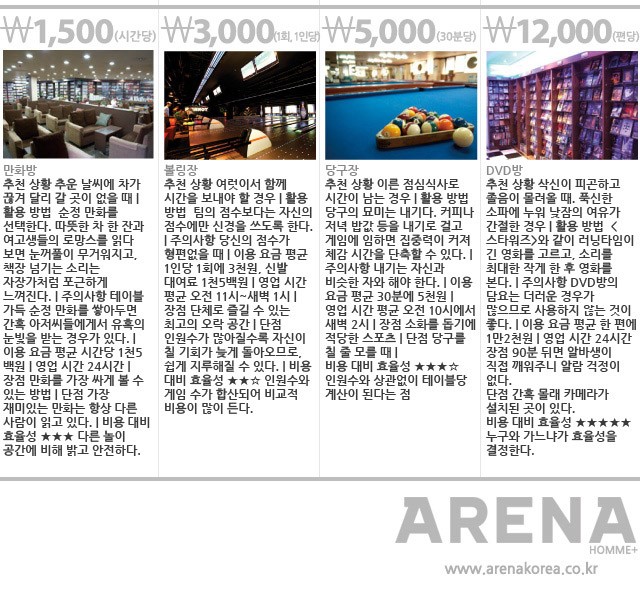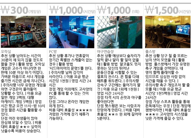 할 일이 없다. 하지만 시간은 무한의 영역으로 들어간 것처럼 느리게만 흘러간다. 뭘 해야 이 따분함을 해소할 수 있을지 고민하는 당신을 위해 킬링 타임용 오락 공간들을 비교 분석해봤다. CREDIT INFOEDITOR 조진혁 PHOTOGRAPHY 최재학