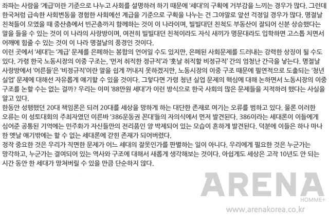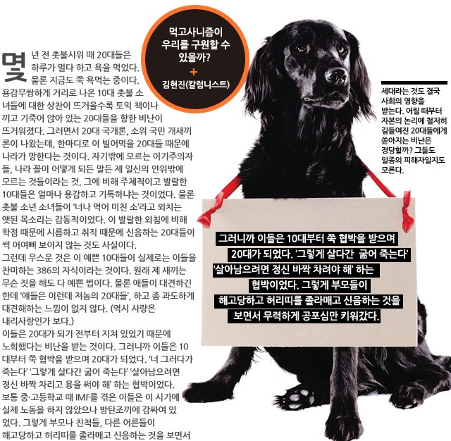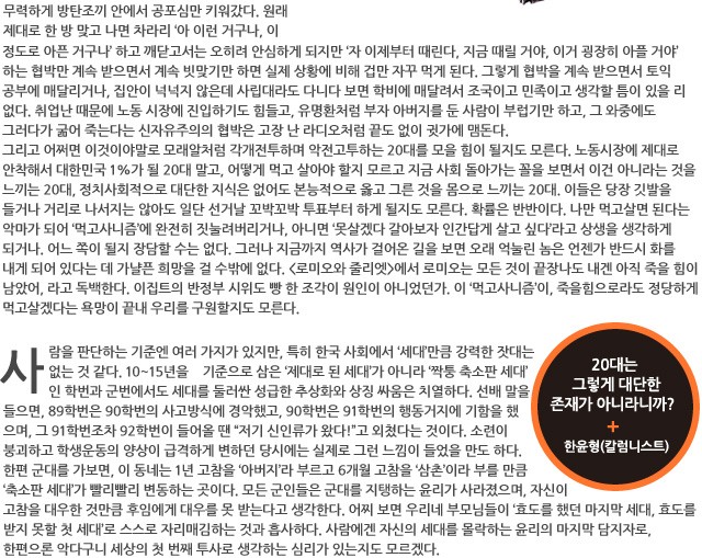 자기 뜻으로 그리된 것도 아닌데, 요즘 20대들에게 쏟아지는 사회의 비난은 끝이 없다. 사회에 대한 분노도, 연대도 모른 채 자본의 논리에 무기력하게 끌려가는 20대를 비난한 `20대 개새끼론`이 나오는가 하면, 세대 간의 단절에 대한 얘기들도 그칠 줄 모른다. 정말 20대는 사회의 암적인 존재가 되어가는 걸까? 20대 필자 두 명이 세대론에 대한 의견을 내놨다.