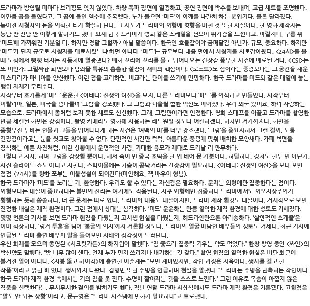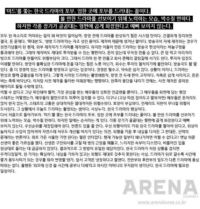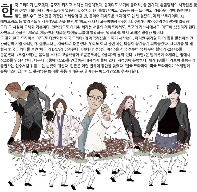 미국 드라마를 쫓아 한국 드라마가 뛴다. 이만하면 폼 나지 않느냐고 으스댄다. 허우대 멀쩡한 외모에 현혹되고 싶지만, 그 이면을 들여다보면 한숨밖에 나오지 않는다. 거울 보며 몸단장하기 전에 종합검진부터 받아보라고 권유하고 싶다. CREDIT INFOEDITOR 김종훈 PHOTOGRAPHY 박종수