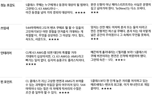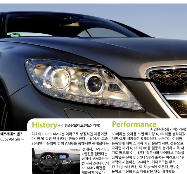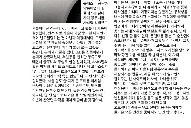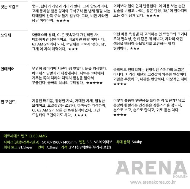 `자동차 좀 타봤다`고 자부하는 세 명의 남자와 아직 그 정도는 아닌 한 명의 남자가 이달 가장 주목해야 할 차를 시승했다. 이 차의 역사와 퍼포먼스, 디자인, 그리고 라이프스타일까지. 이달, 네 남자가 샅샅이 파헤친 차는 메르세데스-벤츠 CL 63 AMG다. CREDIT INFOEDITOR 이기원