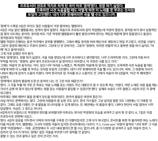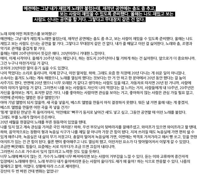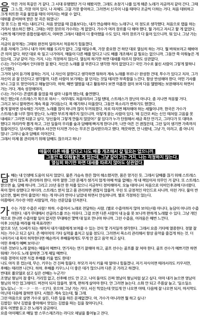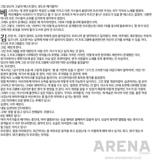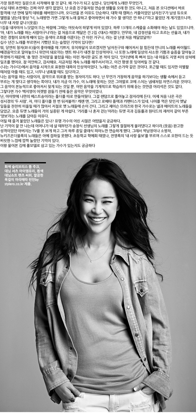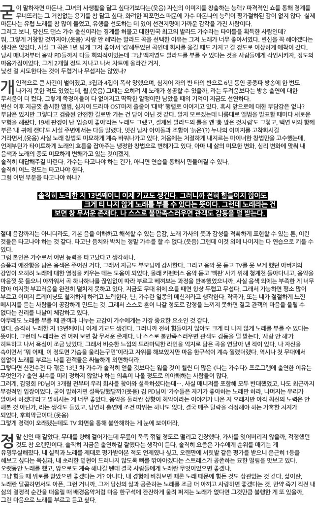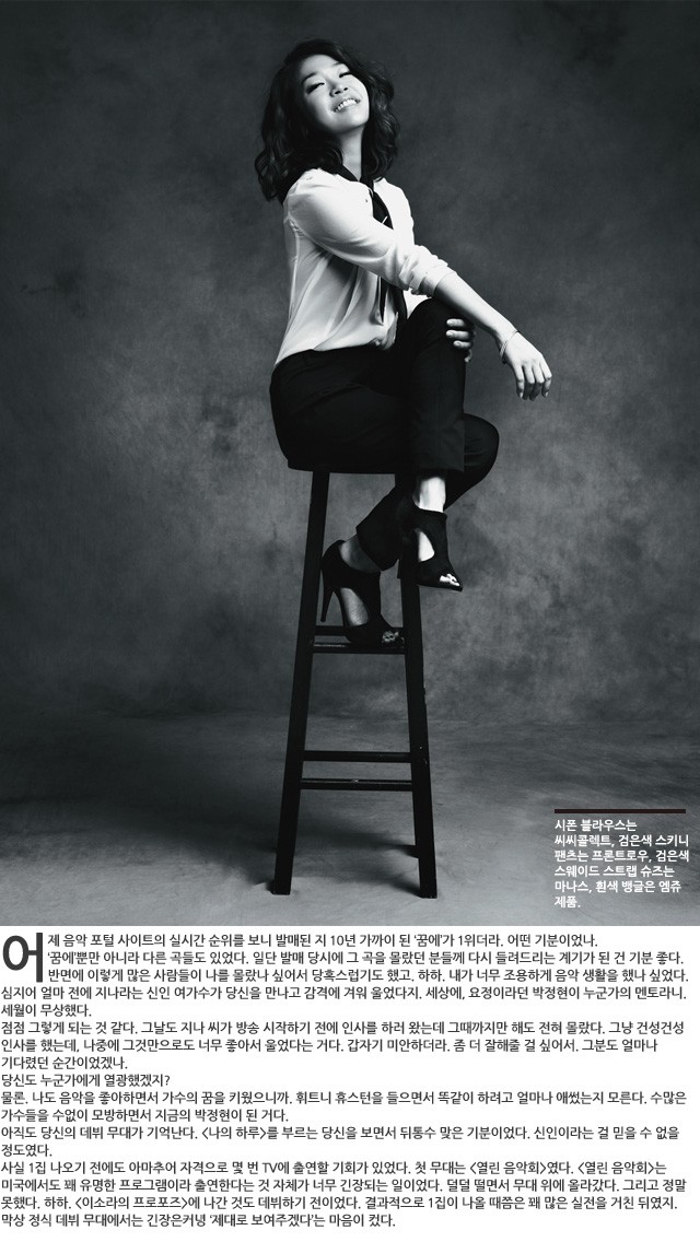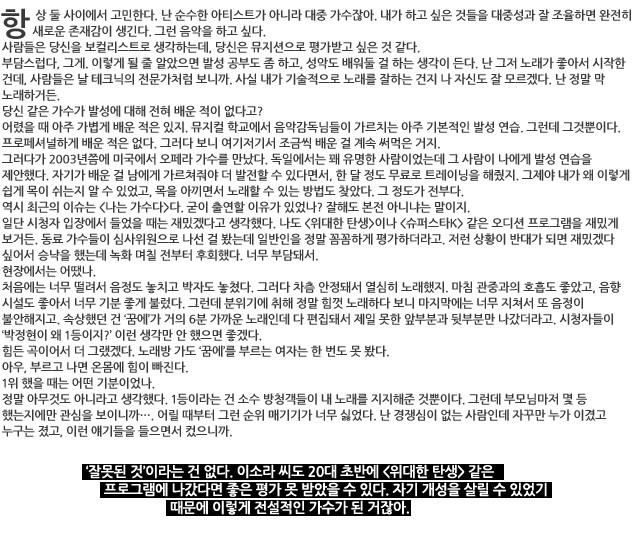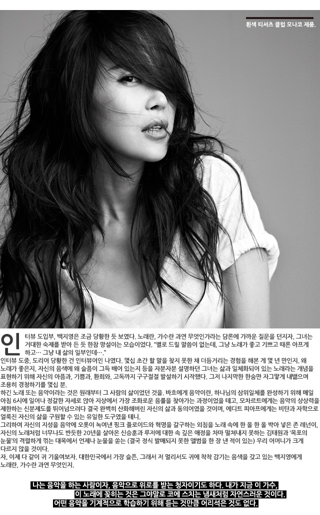 언제부턴가 TV를 틀면 일반인, 정상급 가수 할 것 없이 살 떨리는 오디션 현장의 한복판에서 피 토하듯 절절하게 노래를 부르는 풍경이 일상화됐다. 그러고 보니 참 새삼스러운 질문. 노래라는 게 뭐였지? 가수는? 난 그걸 백지영에게 물었다.