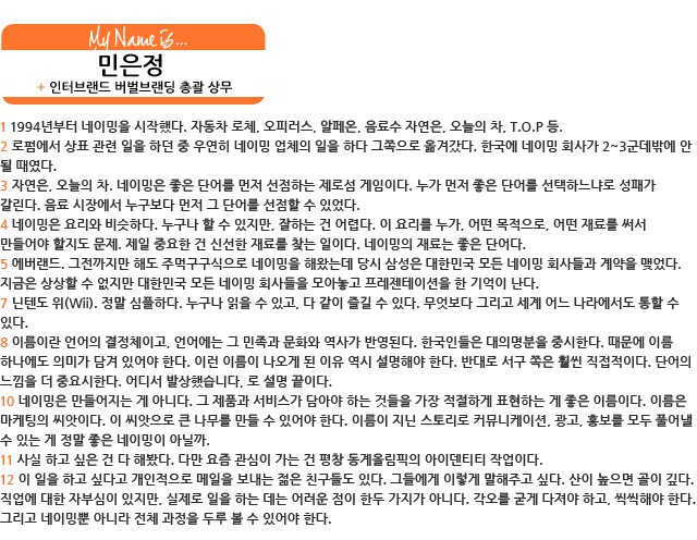 이전 기사보기 다음 기사보기 이름표를 붙여 내 가슴에 글자크기 설정 가 가 기사의 본문 내용은 이 글자크기로 변경됩니다. 스크롤 이동 상태바 미분류기사 이름표를 붙여 내 가슴에 입력 2011.03.26 11:57 댓글 0 글자크기 설정 가 가 기사의 본문 내용은 이 글자크기로 변경됩니다. 기업이나 제품의 브랜드 네임은 대체 누가 짓는 걸까. 어떤 과정을 통해 짓는 걸까. 이름 짓는 장인, 네이미스트라 불리는 세 사람을 만났다. CREDIT INFOEDITOR 이기원 이 기사를 공유합니다 키워드 #가슴 #미스트 저작권자 © 아레나옴므플러스 무단전재 및 재배포, AI학습 및 활용 금지