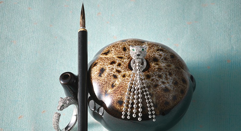 팬더의 얼굴 아래로 태슬 장식을 한 화이트 골드 소재의 팬더 드 까르띠에 이어링 가격미정·화이트 골드 소재에 오닉스와 에메랄드를 세팅해 팬더의 얼굴을 형상화한 팬더 드 까르띠에 링 2천3백만원대 모두 까르띠에 제품.