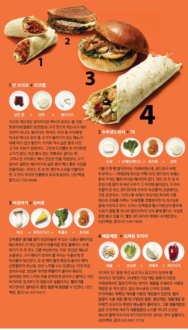 처음엔 실수인가 했다. 분명 이 속엔 쇠고기, 닭고기, 햄, 베이컨 등 육즙 풍부한 고기가 들어차야만 마땅하다. 한데 육류를 쏙 빼버렸다니…. 그럼 대체 무엇이 고기의 자리를 대신하고 있단 말인가. CREDIT INFOGUEST EDITOR 이승률 PHOTOGRAPHY 박원태
