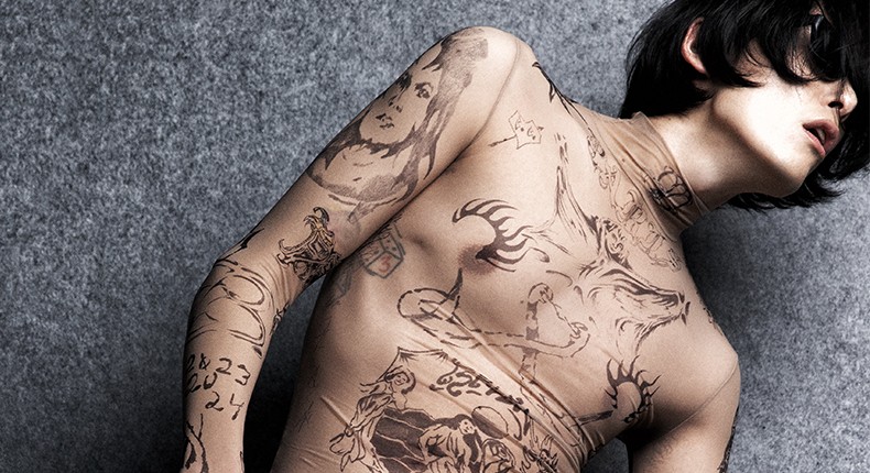 장갑과 일체형인 타투 프린트 시스루 톱·오버사이즈 배기팬츠 모두 가격미정 발렌시아가, 선글라스 가격미정 메종 마르지엘라×젠틀몬스터 제품.