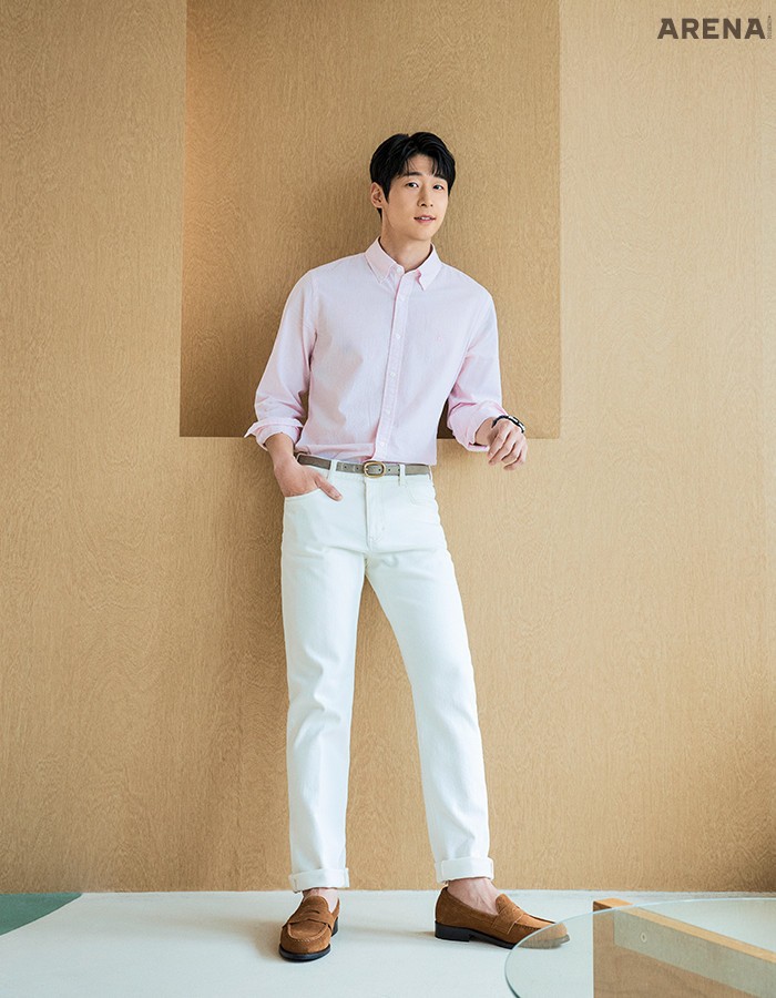 마일드한 컬러감의 핀스트라이프 시어서커 셔츠, 화이트 데님팬츠 모두 올젠 제품.