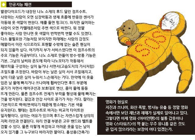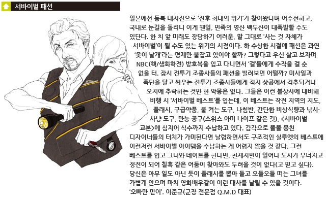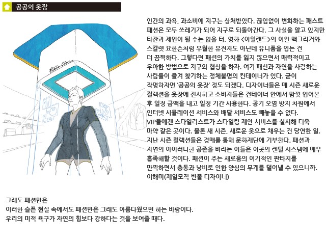 이전 기사보기 다음 기사보기 옷이 방패다. 일단 살고 보자. 글자크기 설정 가 가 기사의 본문 내용은 이 글자크기로 변경됩니다. 스크롤 이동 상태바 미분류기사 옷이 방패다. 일단 살고 보자. 입력 2011.05.03 10:53 댓글 0 글자크기 설정 가 가 기사의 본문 내용은 이 글자크기로 변경됩니다. 쓰나미가 덮치면 옷이 튜브로 변하고 한파가 밀어닥치면 옷은 자체 발열할 것이다. 패션이 창과 방패가 되는 세상은 곧 오고야 말것이다. 라고 쓰고 나니 참 씁쓸하구먼. 이 기사를 공유합니다 키워드 #패션 저작권자 © 아레나옴므플러스 무단전재 및 재배포, AI학습 및 활용 금지