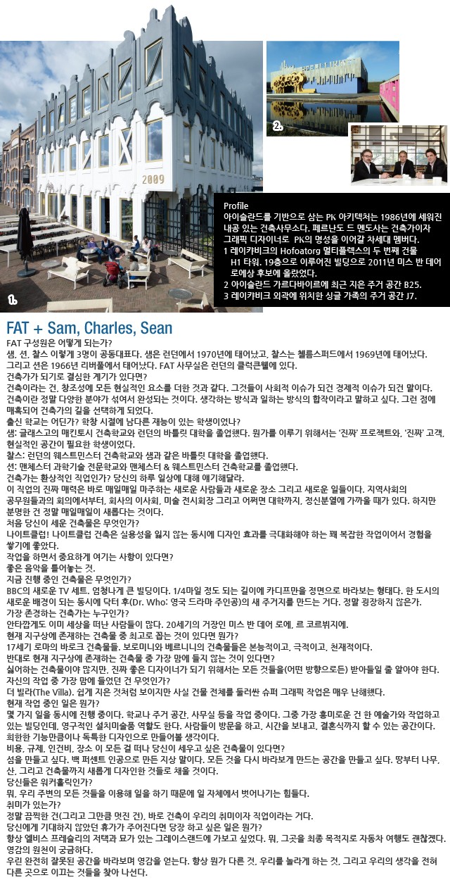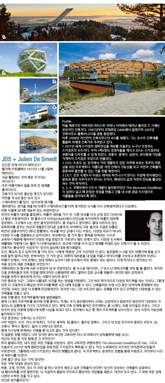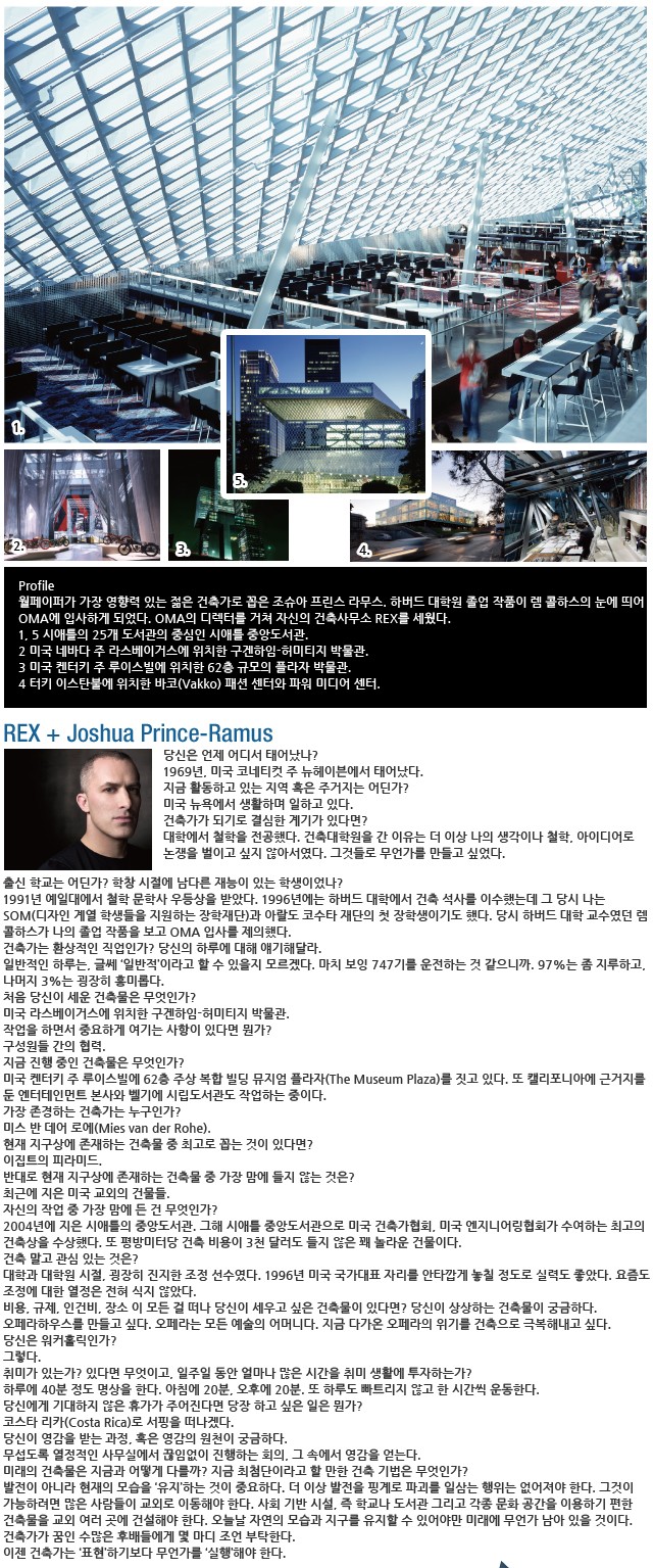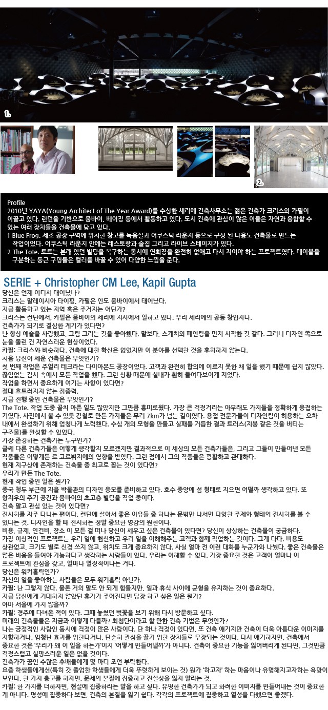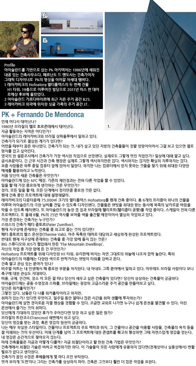 얼마 전 건축가가 섹시한 남자 직업 1위로 뽑혔다. 이성은 물론 동성에게도 매력적인 직업. 건축가. 지금 꽤 잘나가는 젊은 건축가 몇몇에게 인터뷰를 요청했다. 열정적인 답변지와 근사한 건축물 사이에는 호르몬을 자극하는 무언가가 묻어 있다.