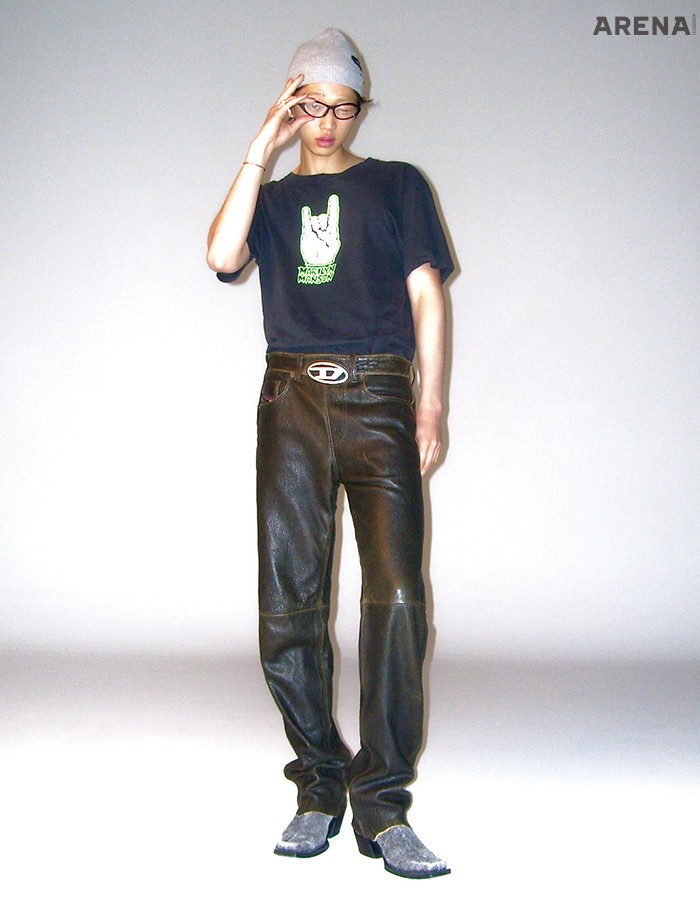 비니·메탈 로고 장식 가죽 팬츠·워싱