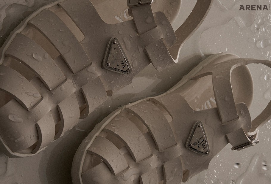 메탈 소재 트라이앵글 로고 장식을 한 러버 소재의 피셔맨 샌들 가격미정 프라다 제품.