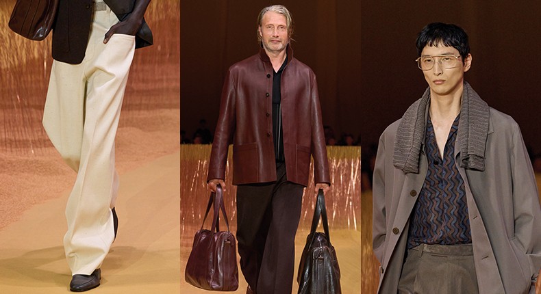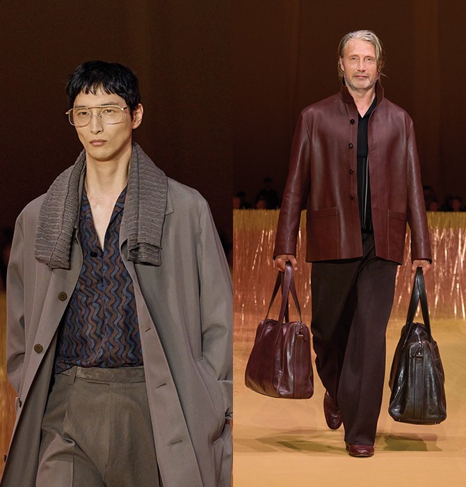 그 어느 때보다 제냐 특유의 어스 컬러 팔레트와 장인정신이 결합한 소재를 풍부하게 활용한 패션쇼는 클라이맥스를 지나 피날레를 향해 가는 듯했다. 제냐의 글로벌 앰배서더인 매즈 미켈슨이 쇼의 클로징을 장식하는 건 당일까지도 예정에 없던 이벤트였다. 예상 밖 그의 등장은 쇼에 극적인 재미를 더했다. 가죽 재킷을 입고 유유히 런웨이를 떠나는 매즈 미켈슨의 뒷모습은 영화적 장면을 선사했다.