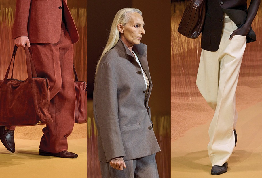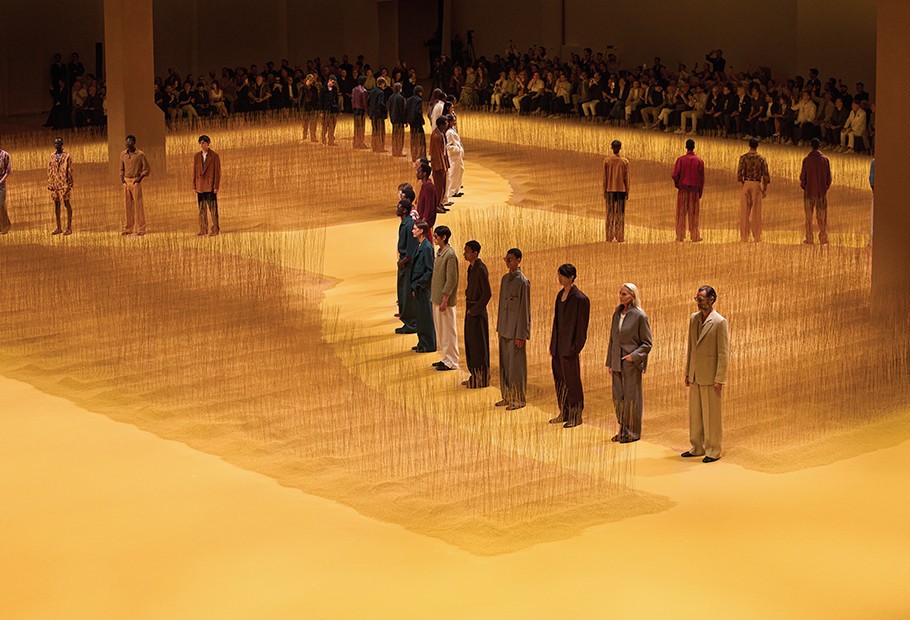 웅장해서 삭막하기까지 하던 쇼장 한복판에 풍성한 황금빛으로 도색한 금속 리넨들이 흔들흔들 게스트를 맞이했다. 알레산드로 사르토리는 늘 이런 방식으로 곧 시작될 쇼에 대한 힌트를 쇼장에 심어둔다. 이번 여름 컬렉션에 제냐의 아이코닉한 오아시 리노(Oasi Lino)가 활약하리라는 예상은 명쾌하게 들어맞았다. 정갈하게 떨어지는 리넨 수트가 오프닝을 열었고, 뒤이어 브라운, 카키, 벽돌색 등 온화하고 진중한 색감의 여름 수트들이 런웨이를 걸어나왔다. 컬렉션 전반의 룩을 톤온톤으로 매치해 이탈리아 브랜드 특유의 세련된 여유로움이 넘쳤다. 오아시 리넨의 고급스럽고 유연한 질감을 살려 직조하거나 뜨개질로 완성한 니트 셔츠를 비롯해 수트, 아우터로도 활용한 노치리스 칼라의 오버셔츠는 편안하게 몸을 감싸며 볼륨감 있는 형태를 완성했다.